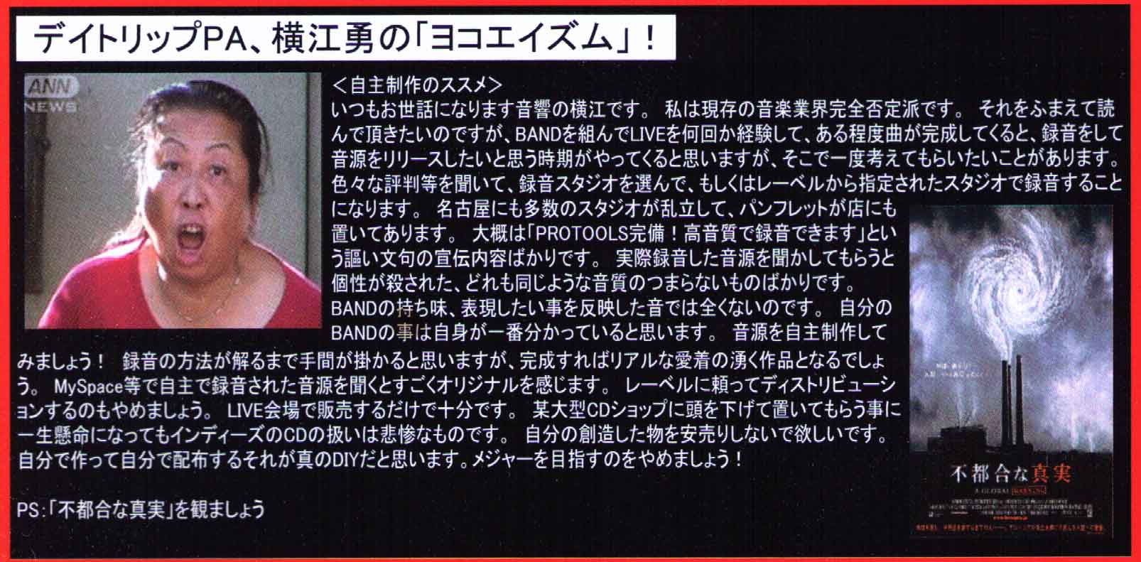 スタジオにはいろいろなライブハウスからスケジュールが送られてくるんだが、経費節減なのかDay Tripだけはスタッフが手持ちでやってくる。(でたまに来ないこともあるんだが…)他の店と違ってライブスケジュールの裏面は、スケジュールと関係のないスタッフのコラムで 、結構楽しみにしている人もいるみたいだ。私はトシなので、時が小さすぎて読む気になれないんだけど、たまたま読んでふーんと思ったのがこれ。