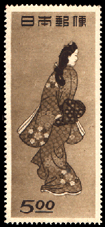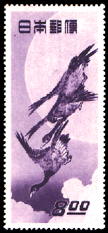 で、その当時キッズのあこがれが「見返り美人」と「月に雁」だったんだな。切手趣味週間という一連のシリーズの中でも縦長の大型切手で、1948年と49年にそれぞれ5円と8円の額面で発行、1976年のカタログによるとそれぞれ13,000円と19,000円の価格が付いている。はがき10円バスが30円の時代である30年以上前だと考えれば、現在では5〜8万円の価値があったことになる。